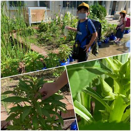 水やりは大切! 公開日 2020/07/22 更新日 2020/07/22 低学年 7月22日(水) 1年から3年生の子は、自分の育てている花や野菜に水やりをしてから教室へ行きます。暑くても頑張って水やりをしています。 例年ならば、これらの鉢はに自宅へ持ち帰り、観察をしていることになります。今年は、学校で継続して観察をすることができます。ホウセンカはつぼみがつき始め、これから花が咲き始めます。今年はみんなのホウセンカが咲きほこる様子を見ることができそうです。とても楽しみです。
