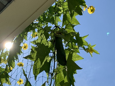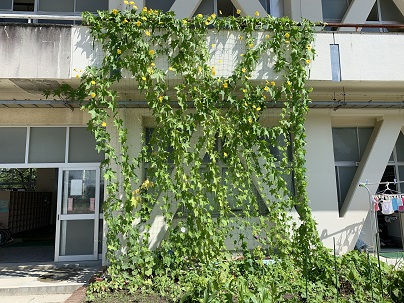4年生のヘチマです。ずいぶん成長し、グリーンカーテンになりました。ヘチマの実もなっていますよ!