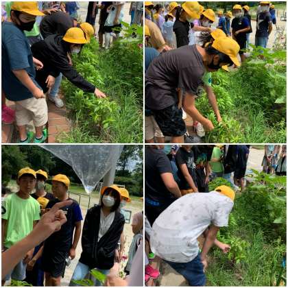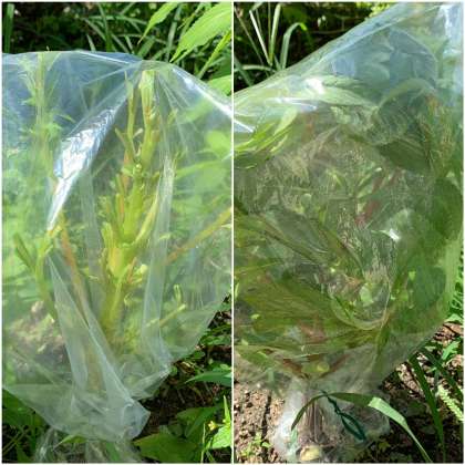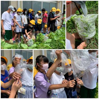 葉まで運ばれた水はどうなるのか、ホウセンカを使って実験をしました。葉を残したホウセンカと葉を取り除いたホウセンカに袋をかぶせて、水蒸気が出ているかを調べました。結果ははっきりとわかりましたね。ずいぶんたくさんの水が袋にたまっていてびっくりですね。