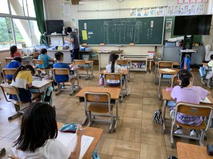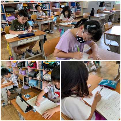 今日は、みんなに伝えたいことやものを決めて、メモをもとに「はじめ」「中」「おわり」の組み立てを考えました。