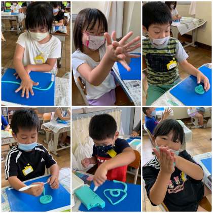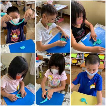 ねん土でひもを作って、いろいろな形を作りました。