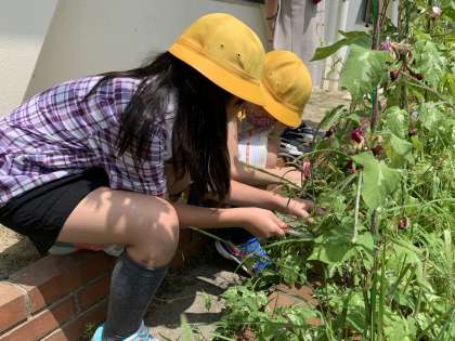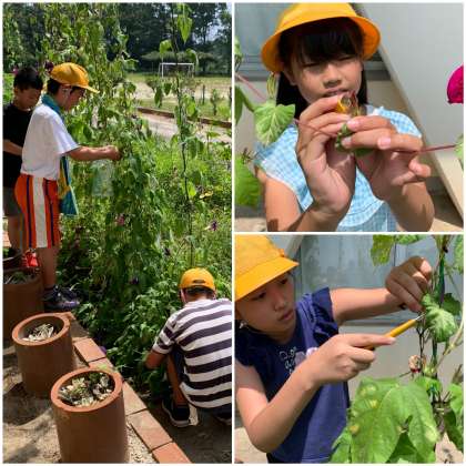 あさがおの花を使って実のでき方を調べます。めしべの先に花粉をつける花とつけない花で、実の付き方はどう違うでしょうか。暑い中でしたが、頑張って実験の準備をしました。