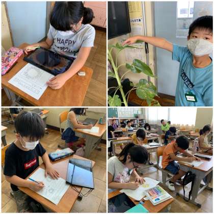 タブレットPCを活用して、ヒマワリの様子の写真を撮りました。自分の撮った写真のできばえにご満悦!教室で写真を見ながら、記録の記入もしました。元気に咲いているひまわりのように、暑さに負けずに頑張って学習に取り組んでいます。