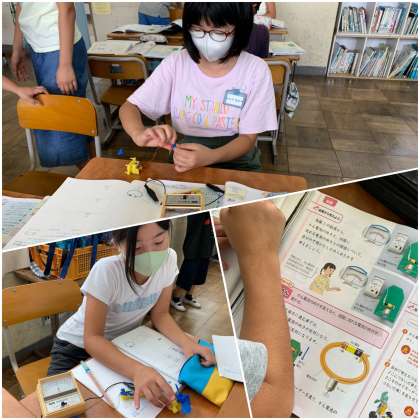 かん電池の向きと回路に流れる電流の向きとの関係について、検流計を使って班ごとに実験をしました。電池の向きを変えてみると、検流計の針の向きも反対に振れます。ここから、かん電池の向きを変えると、回路に流れる電流の向きが変わることがわかりますね。見えない電流も、検流計によって流れを確かめられます。