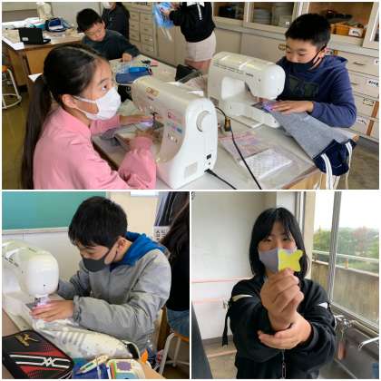 マイバッグ作り〜いよいよ仕上げ! 公開日 2020/10/23 更新日 2020/10/23 6 年 10月23日(金) 今日の作業は、仕上げとして、バッグに飾りを付けたり、まちを縫ったりしました。完成した子は、小物作りに取り組んでいます。