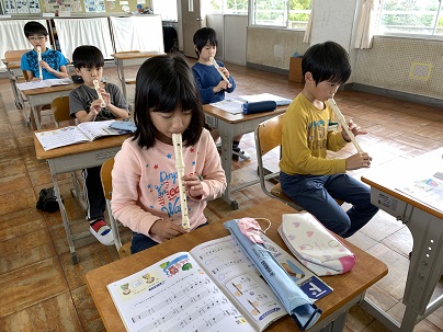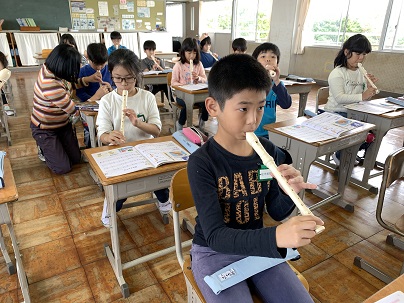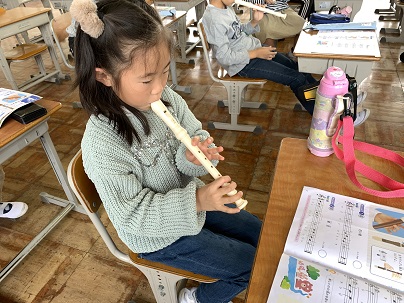 リコーダーで「河はよんでる」の練習をしています。高い「ド」の音を上手に響かせるように練習をしています。みんな頑張って練習をしています。肘をつかないように、姿勢も気をつけましょう。