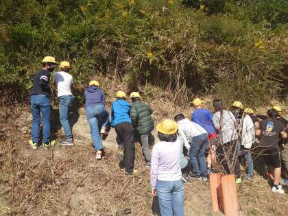 鈴渓会館近くの地層に到着しました。地層の様子をよく見て、観察をしています。
