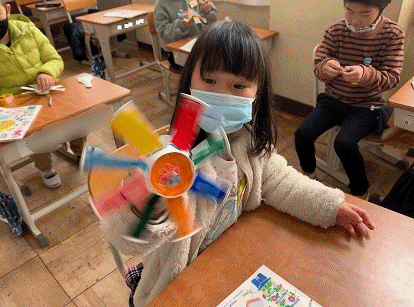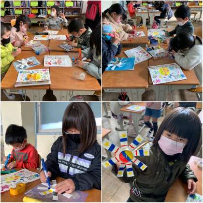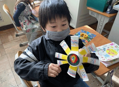 生活科の学習で、風車を作って遊びます。今日は風のとても強い日です。みんな早く完成させて、外で回したくて仕方がないようです。しかし、思いのほか色塗りに時間をかけてしまい、今日はここまで。次の生活科の時間に完成です。