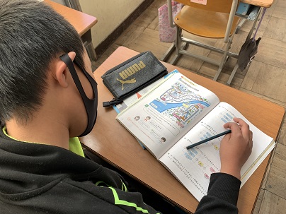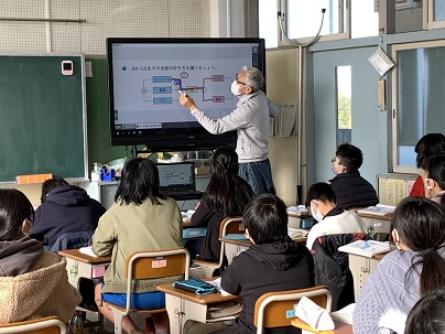 地図上のAからDまで行くのに、様々な乗り物を使って移動します。どのような行き方があるのか、全部の行き方を調べて、いろいろな目的に合う場合を見つけていきます。電子黒板を使ってどんな行き方があるのかみんなで確認をしています。