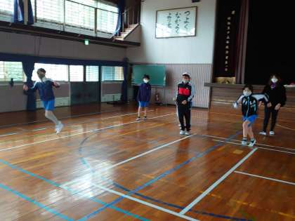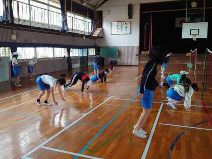 体育のソフトバレーボールの前の準備運動で体力作りをしていました。体を動かすのが大好きな5年生。中野先生の合図でしっかりと体を動かしていました。寒い中ですが,体力をしっかりとつけていきましょう。