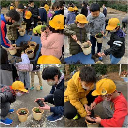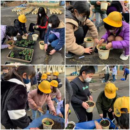 卒業式を飾るパンジーを一人一鉢育てます。卒業式の主人公である6年生とペア学年の1年生が準備をしました。さすがは6年生!優しく1年生のお世話をしながら、自分のパンジーの準備をしてくれました。こういった優しく頼もしい6年生の姿を1年生のみなさんには、しっかりと覚えていてほしいと思います。