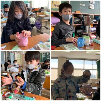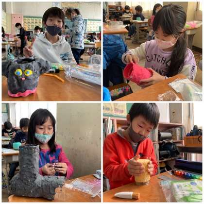 紙粘土に絵の具をまぜて、カラフルな飾りをつけています。