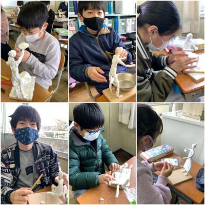 12年後のわたし、スポーツをしているわたしをテーマに自分の姿を作っています。番組プロデューサーやデザイナー、野球やバスケットボール、空手やバドミントンなどをしている自分の姿を作っています。うでの様子や向きに気をつけながら、紙粘土で肉付けをしています。とても集中して作業に取り組んでいる6年生のみなさんです!