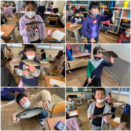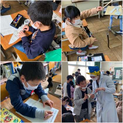 2年生の食の指導にさかなクン登場!よく見たら、栄養教諭の斎藤先生ですね。今日は、さかなクンに扮した齊藤先生と「魚はかせになろう!」をテーマに学習をしました。常滑の沿岸で獲ることができる魚の名まえと姿を知り、班に分かれて釣りゲームをしました。大きさや旬などを確認して、プリントに記入しました。みんなさかな博士になれたかな?