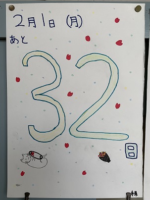 卒業まで・・・ 公開日 2021/02/01 更新日 2021/02/01 6 年 2月1日(月) 6年生の教室前には、卒業までのカウントダウンカレンダーが掲示されています。一人ずつ頑張って作りました。 早いもので、卒業まであと32日となりました。