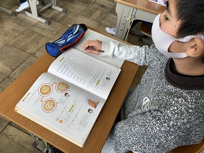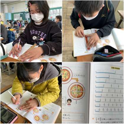 今日は分数の数直線を使って、等しい分数を見つけました。2分の1に等しい分数は、4分の2の他にも分母が10までの分数に、3つあることがわかりましたね。