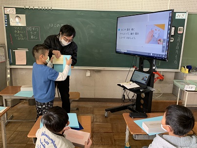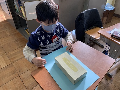 はこの面を紙にうつしとって、面の数を調べます。どうやって写しとりますか?自分の考えた方法をみんなの前で発表しています。