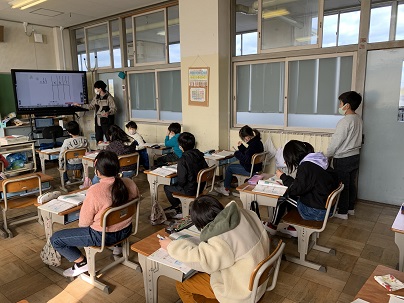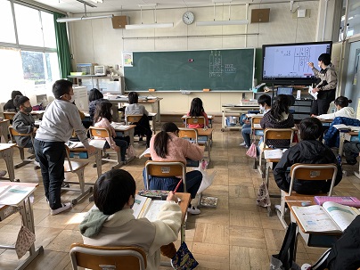23×34のような(2けた)×(2けた)の計算を筆算でしました。かける数の十の位である3をかけるときに、答えを十の位から筆算では書きます。一の位は0になりますが、この0は書きません。丁寧に計算の仕方を確認しながら、答え合わせをしています。