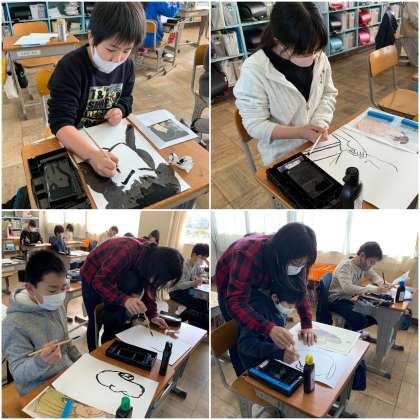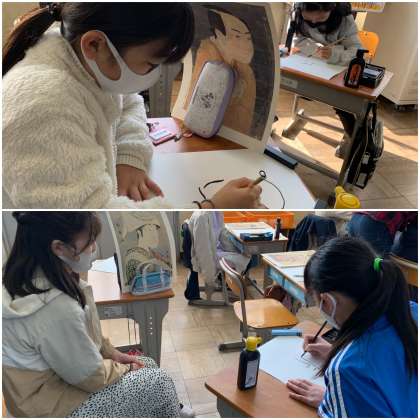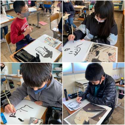 炭と筆を使って、浮世絵の模写に挑戦しました。目つきや表情、線の太さなど浮世絵の特徴をとらえて写しています。なかなかみんな上手ですよ!