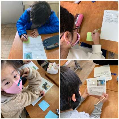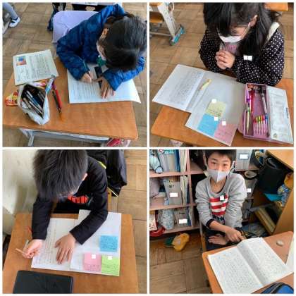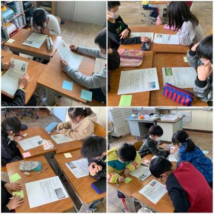今日はその紹介文を読み合っています。友達の紹介文を読んで、書き方や内容についてのよいところを見つけ、付箋に書いています。