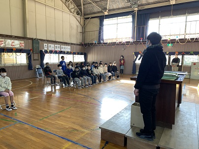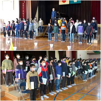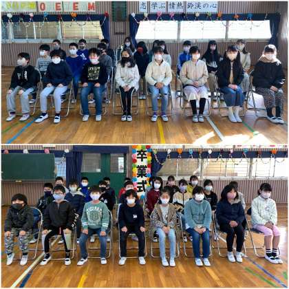 19日の卒業式に向けて、総合練習を行いました。本番通りの進行を行い、流れや動きについて確認をしました。4,5年生が、6年生の動きの全体を見るのは、これが初めてになります。真剣に取り組む6年生の様子は、きっと4,5年生の印象に残ったことと思います。練習に臨む4,5年生の姿勢から、6年生のために頑張ろうという意識を強く感じました。