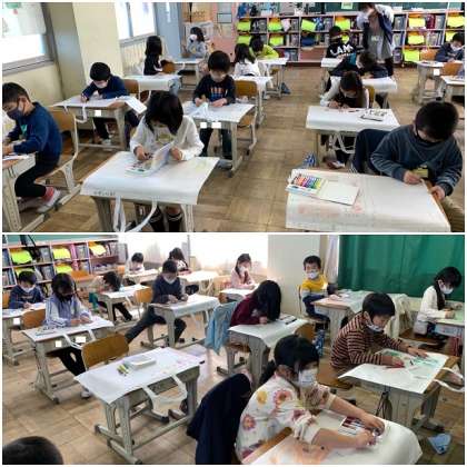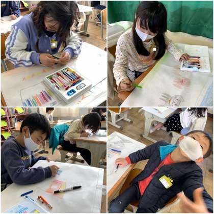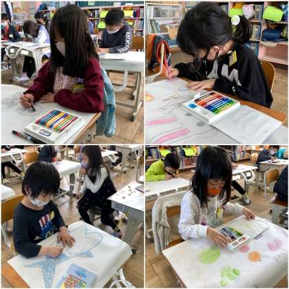 図工で作った作品を入れるための作品バッグに絵を描いています。果物や動物など自分の好きな物や、海や想像の世界など各自で自由に描きました。みんなとても楽しそうに描いています。この作品バッグと一緒に、1年生で作った作品を大切な思い出となることを願っています。