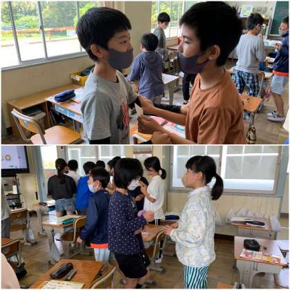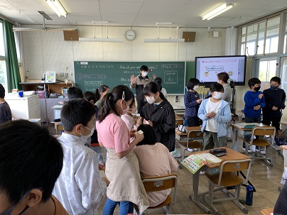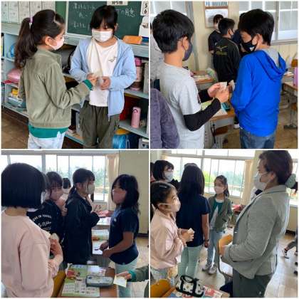 名刺カードに自分の名前と好きなスポーツを記入して、友達の好きなスポーツを紹介し合っています。今日のミッションは、自分の名前を書くことと好きなスポーツの名前をたずねることです。みんな楽しそうにたずね合っています。
