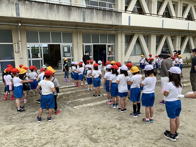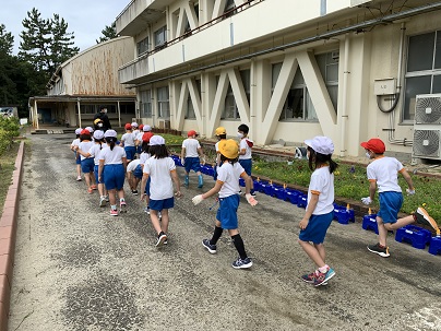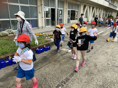 1,2年生とすずらん学級の皆さんが、さつまいもの苗を植えるためにはために向けて出発!雨も上がって、よかったね!