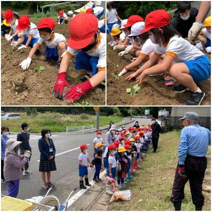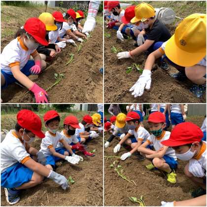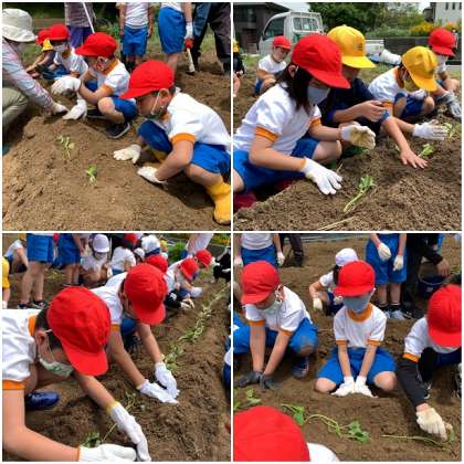 朝方まで降っていた雨も上がり、晴れ間も見えるいい天気になってきました。大きなおいもが育つように願いを込めながら、みんながんばってさつまいもの苗植えをしています。どんなおいもができるか楽しみだね!