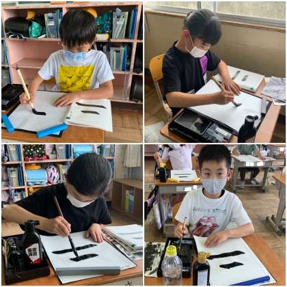 穂先の向きに気をつけて、始筆、送筆、終筆の筆遣いに気をつけて「二」の練習をしました。筆の傾きや姿勢も大切です。