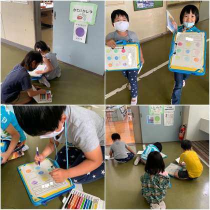 今日はお友達とペアで学校探検をしました。ペアの友達と教室を探し、教室の出入り口で教室の決められた色をプリントに塗っていきます。全部で9つの○に色塗りできれば完成です。全部塗ることができて、とってもうれしそうな1年生です!