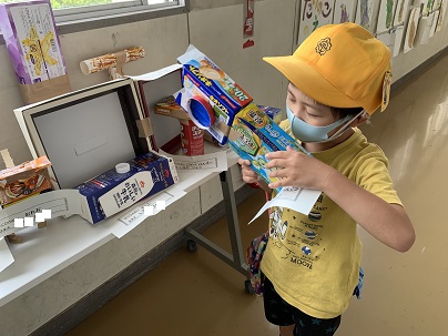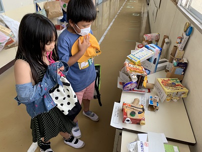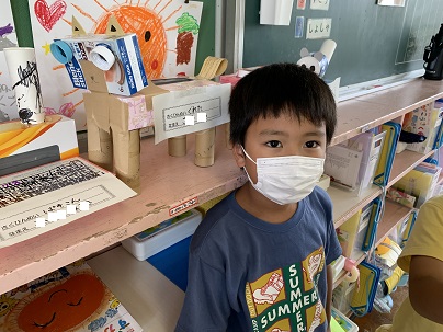 箱を使って、乗り物や動物などいろいろなものを想像して作りました。完成した作品を自慢げに教えてくれる1年生のみなさん。完成した作品のできばえに満足そうです。