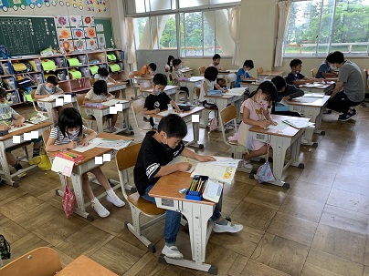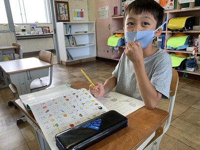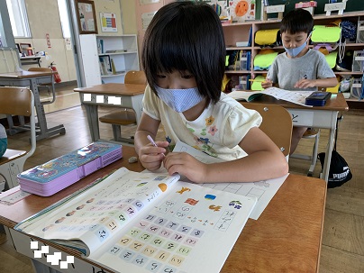 ひらがなの学習もかなり大詰めです。今日は、50音表を見て、ひらがなの練習です。はねるところや払うところにも気をつけてひらがなを書いています。