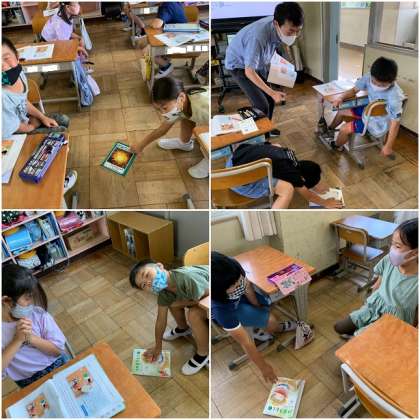 車椅子の友だちがいる学級での出来事を通じて考えています。車椅子のお友達を助けてあげたいのですが、車椅子のお友達は自分のことは自分でできるようになりたいと考えています。車椅子のお友達とそれを見守る子に役割をわけ、それぞれが演じてどう思ったかを教科書の吹き出しに記入をしています。道徳の授業では、登場人物の気持ちを実感するために、役割演技は大切な手法です。