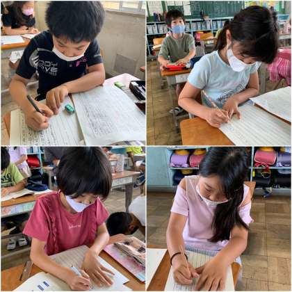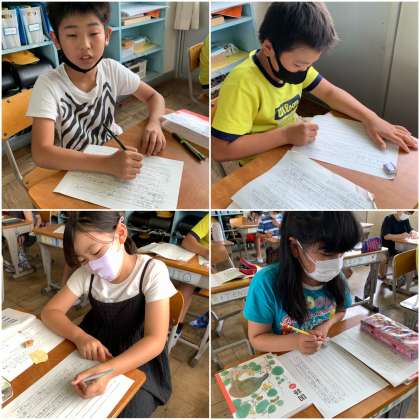 国語の学習で、学習でお世話になった方へのお礼の手紙を書く学習を行います。先日行ったごみ減量教室でお世話になった講師の皆さんにお礼の手紙を書くことになりました。みんな頑張って書いています。お礼の気持ちが伝わるようにするにはどうすればよいのか、よく考えて書きましょう!