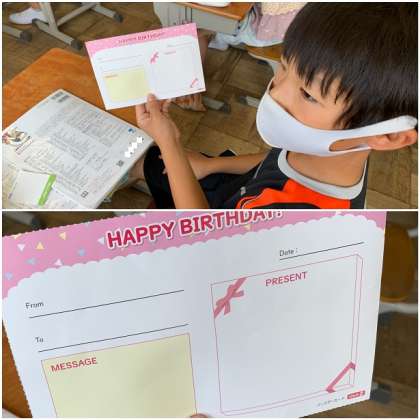 ペアでバースデーカードを交換します。誕生日や欲しいものを英語でたずね、バースデーカードを作ります。