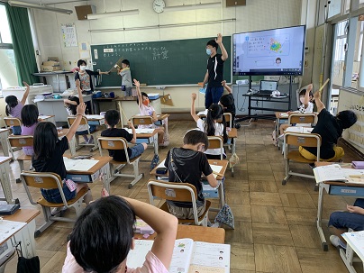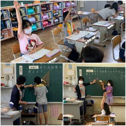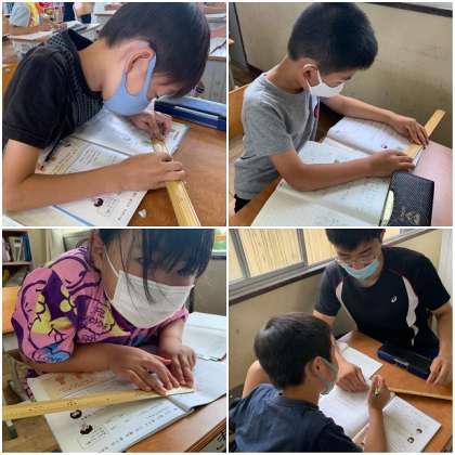 竹のものさしを使って、教科書の挿絵中の直線の長さを測っています。竹のものさしを使って学習をしていますが、このものさしの欠点は、ちょっと見づらい点でしょうか。ちょっぴり苦労しながら、頑張って長さを測っています。