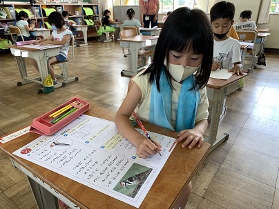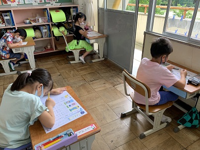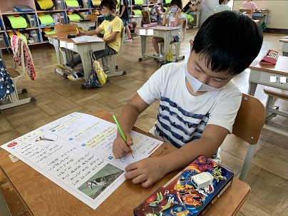 国語のテストをしています。しっかり読んで、大きな字で答えを書いています。みんな頑張ってテストを受けています。