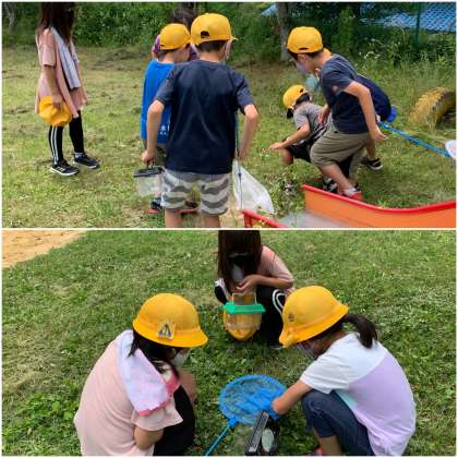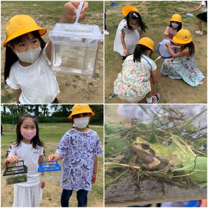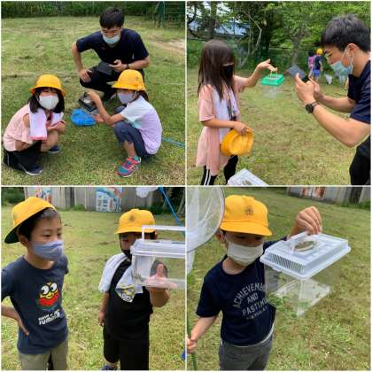 生活科の学習で運動場にいる生き物を探しました。昆虫やカエル、トカゲも見つけました。たもを上手に使って、チョウを捕まえた子もいます。みんな捕まえた生き物を自慢げに見せてくれます。