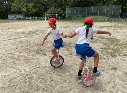 一輪車の上手な子は、いろんな技ができます。今日は二人で手をつないで、メリーゴーランドです!