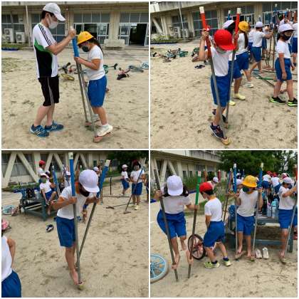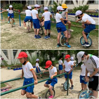 3年生が体育で一輪車と竹馬の練習をしています。放課に遊んでいる子は、やはりじょうずに乗ることができます。