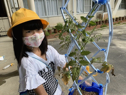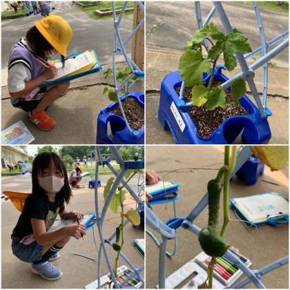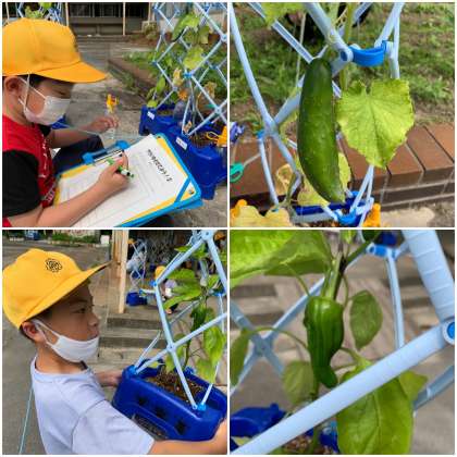 自分の育てている野菜の観察をしました。キュウリやピーマン、ナスやトマトがなってきました。みんなとってもうれしそうです。自分の育てた野菜の味が、とても楽しみな2年生です。