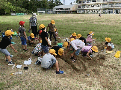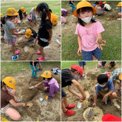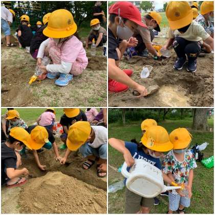 突然の雨で延期になった「すなやつちとなかよし」を行いました。みんなとても楽しみにしていただけに、うれしそうに取り組んでいます。水路やダム、山もあります。大きなケーキやプリンも作っています。友達と協力して、仲良くつくろうね!
