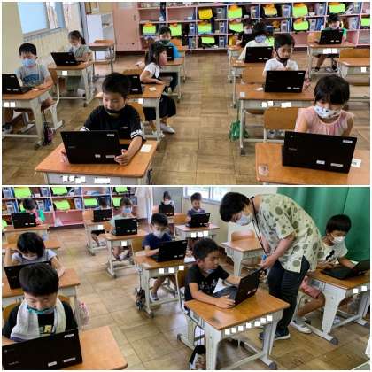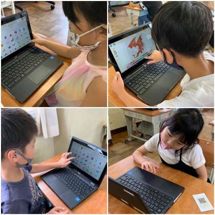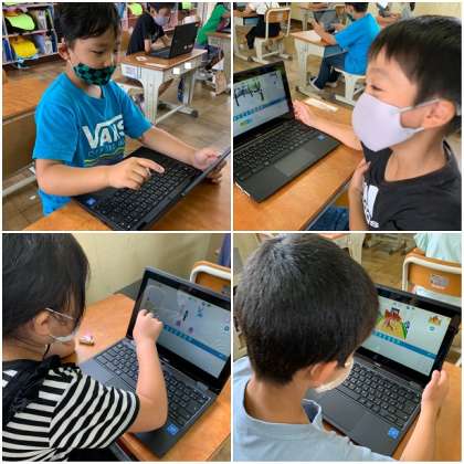 プログラミングソフト「スクラッチjr」に挑戦です。初めての使うプログラミングソフトでしたが、みんなの見込みは本当に早い!動物等のキャラクターを動かすプログラミングを作って楽しんでいます。