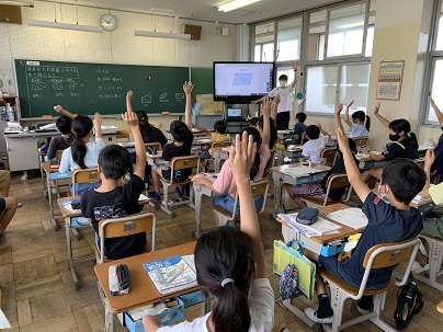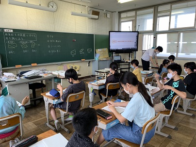 長方形、平行四辺形、台形を対角線で2つの三角形に分け、その三角形が合同になるか調べます。切り取った三角形をノートに貼り、結果も合わせて記入しています。合同になったのはどの四角形だったでしょうか?