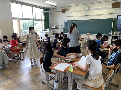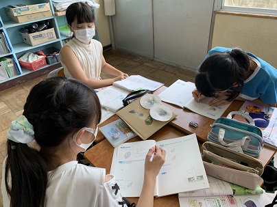植物の葉にデンプンがあるか、ヨウ素液を使って調べました。インゲン豆の葉をたたき、その葉から出た汁にヨウ素液をつけると・・・見事に青紫色に変化しました!葉にデンプンがあることがよく分かりますね。
