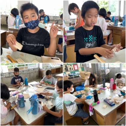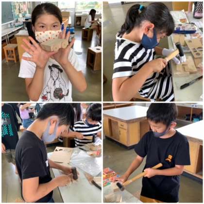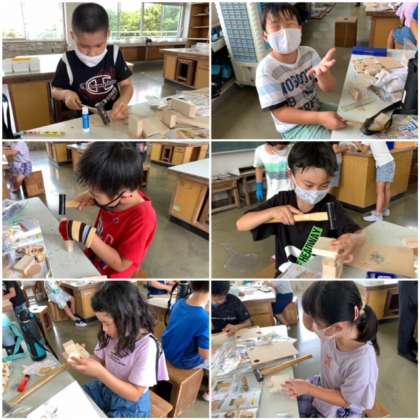 くぎ打ち名人! 公開日 2021/07/14 更新日 2021/07/14 3 年 7月14日(水) 図工室から、トントンと金づちでくぎ打ちをする音が響いてきました。3年生が先週の練習に引き続き、作品作りに取り組んでいました。手を守るための手袋をしています。それでも指を叩いたら痛いですから、十分に気をつけてくださいね。 目指せ!くぎ打ち名人!