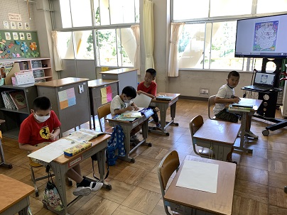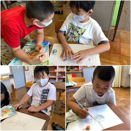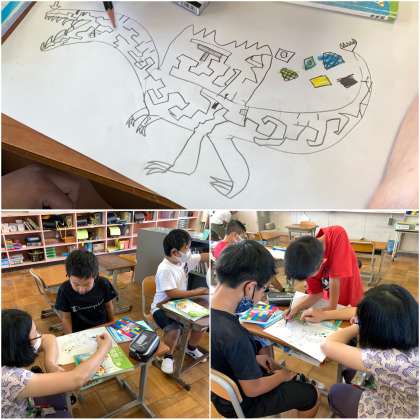算数の時間に迷路を作りました。細かい迷路を作る子、恐竜を描き中に迷路を書く子などみんななかなか工夫を凝らして考えています。友達の迷路が気になってしまうすずらんの皆さんです。