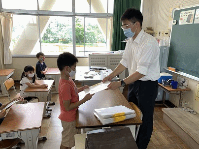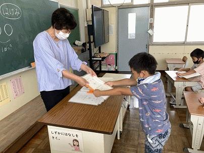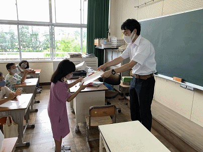 3時間目の学活では、通知表を受け取ります。担任の先生から、一言ずつメッセージをもらいながら受け取ります。わくわくする気持ち、ドキドキする気持ちが伝わってきます。初めて通知表を手にする1年生のみなさんは、とってもうれしそうです!