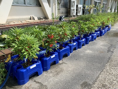 3年生のホウセンカです。どのホウセンカも元気に大きくなっています。赤と紫の2種類の花の色がありますよ!